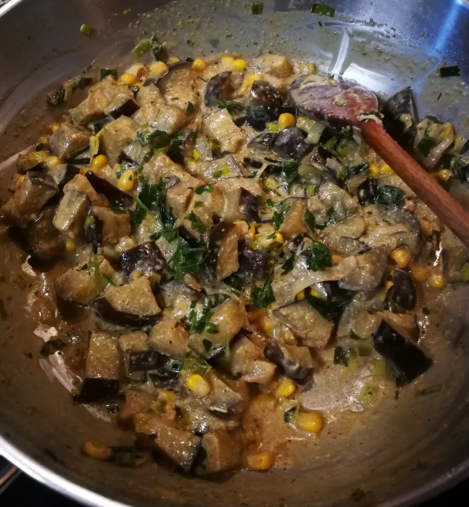 After about 15 minutes it started to look like it’s almost done, so I added the following, I try to remember the order (not that it would matter…): curry (just enough to HAVE a taste, but not to dominate completely), pepper, soy sauce, nutmeg, rosemary (dried), basil (frozen), a hint of lemongrass (frozen), and I poured coconut cooking milk on it (about 1 dl, I think), which might have been even too little, as by the time of serving, the eggplants absorbed most of it. I mixed the whole thing and covered it for another 5 minutes.